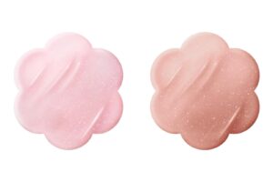 中のリップバームも、スイーツに着想した甘美なカラー。ストロベリークッキー風のピンクと、チョコレートクッキー風のブラウンは、どちらも大粒のパール入りで、ぷるんとした唇を叶えてくれる。使用感はとろけるように心地よく、血色感とツヤ感とともに、うるおいをももたしてくれる。